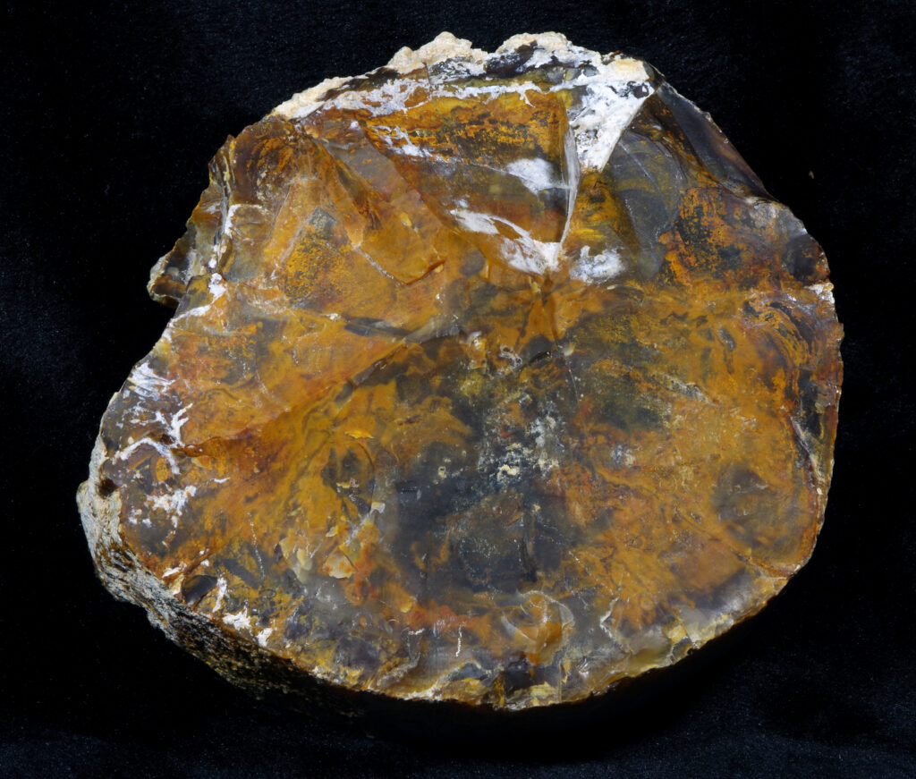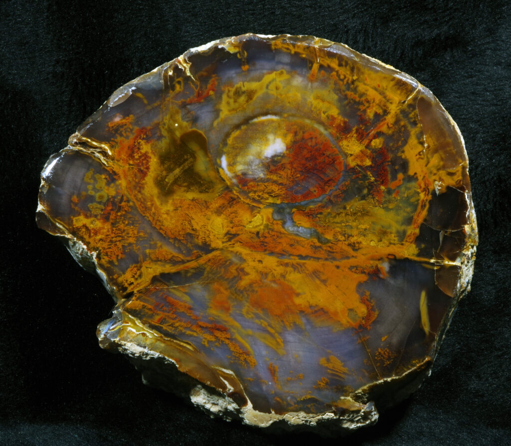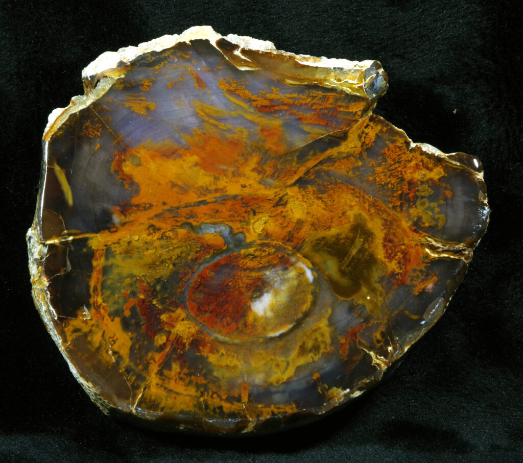FJD OR 164. Grassy Mountain Museum specimen. Succor Creek formation; Miocene, Malheur County. Full round slice. 12 by 13 cm mirror-polished face; 12 mm thick; twelve ounces.  SOLD