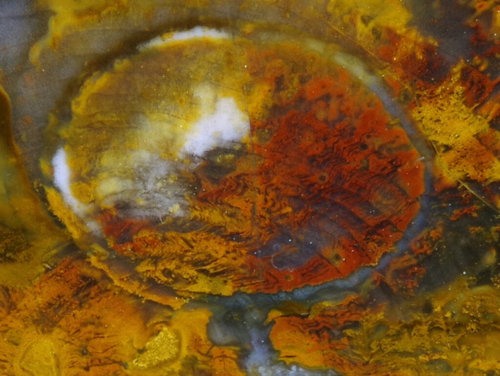 OR 68. Sweet Home . Full round hardwood slice. Mineralization is NOT typical Sweet Home. When I first saw this wood, I thought it was from Wyoming’s Blue Forest or Eden Valley, but I was mistaken. The Sweet Home area has produced a wide variety of wood. Most is rather dull but often a fractureless full round, but a small percentage resides at the apex of attractively mineralized wood. This is one. Riddled with borer tunnels. Another great one under magnification. Well preserved structures in places. Blue agate. 6 by 7.5 cm mirror-polished polished face; 7 mm thick; two ounces.  $50