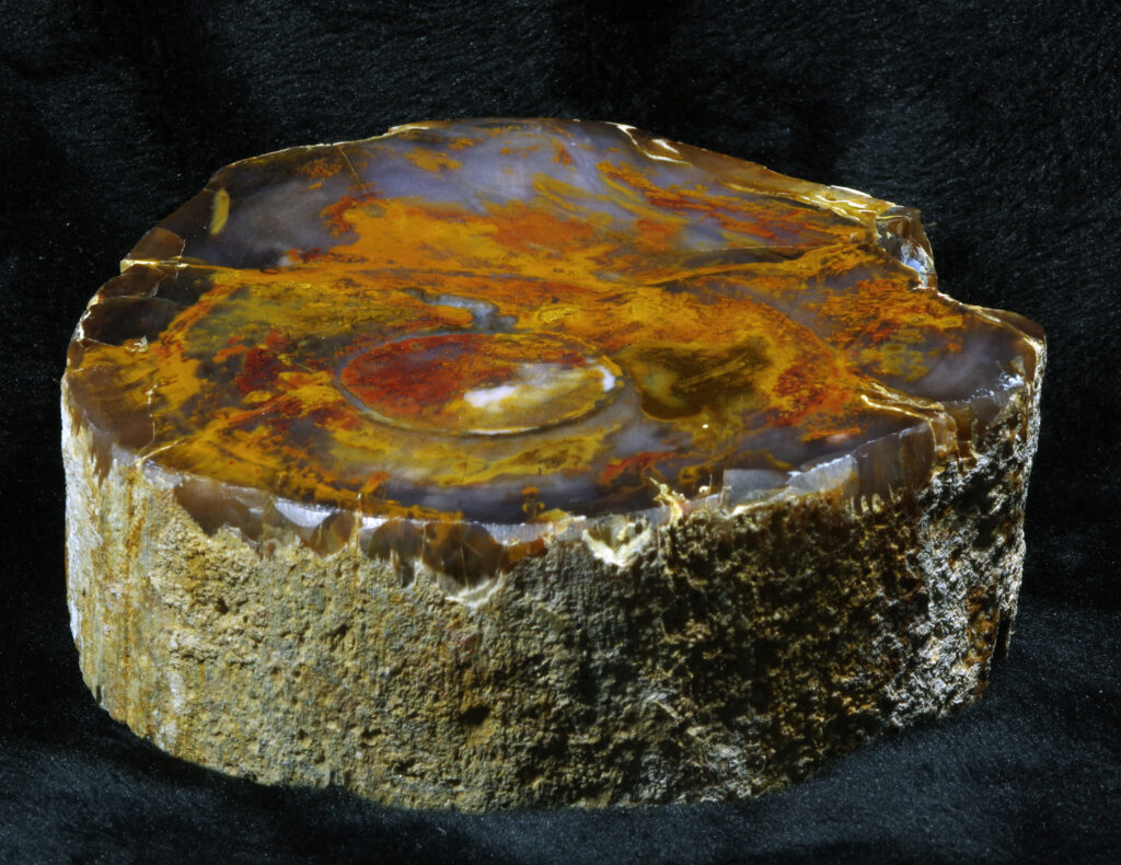 OR 1020. Grassy Mountain. Miocene. Diffuse porous hardwood. Full round limb section with fabulous colors and patterns that amaze under magnification. One natural end. 7.5 by 8.5 cm polished face; 3 cm thick; one pound ounces. $350