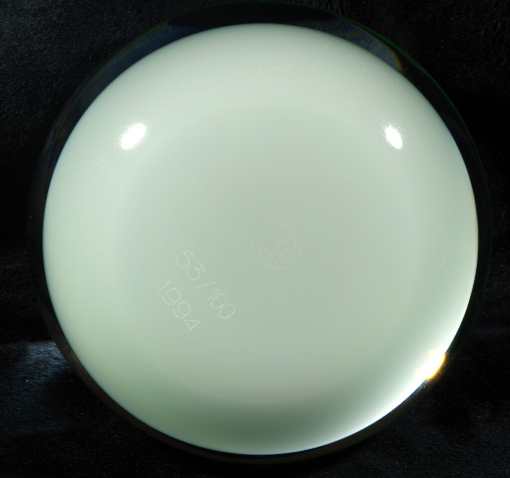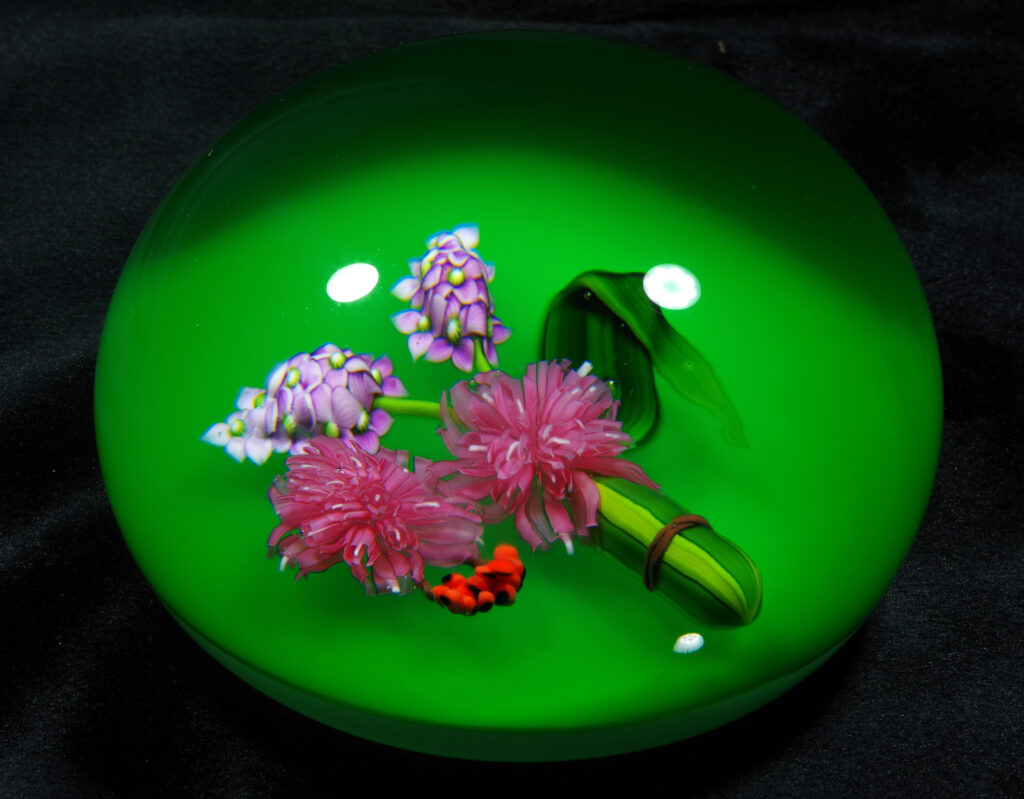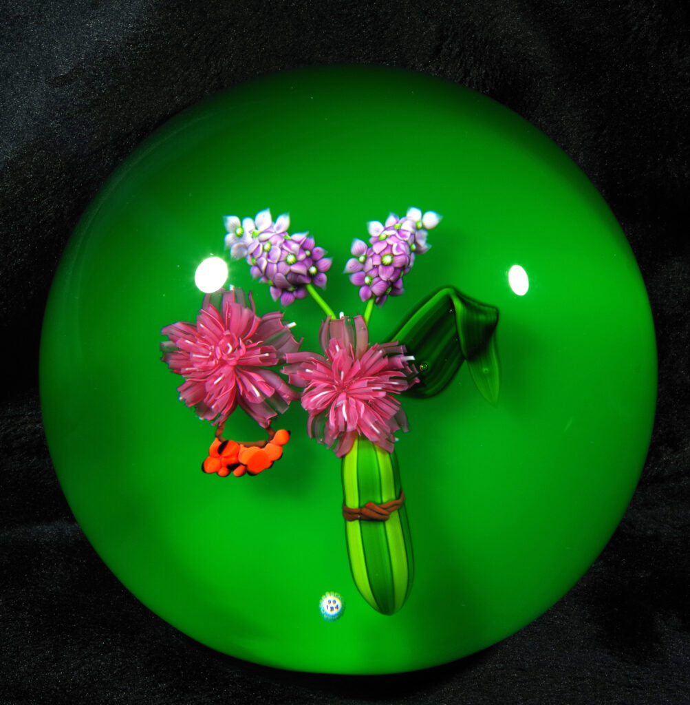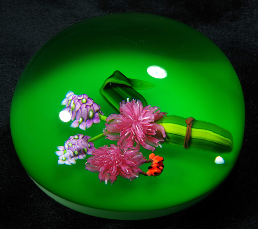 PW3047. Saint Louis/Hermes 1994 Museum Piece. Extra magnum size complex paperweight. From Baccarat Paperweights by Paul Dunlop: “A delicate bouquet of carnations and lilacs, Bouquet d’oeillets et lilas appears on an opaque green ground. This elegant weight was produced in an edition of 100 examples.” Numbered 53/100 and 1994. Etched Baccarat logo on base. It also has a signature cane B1994. Condition is pristine/perfect.