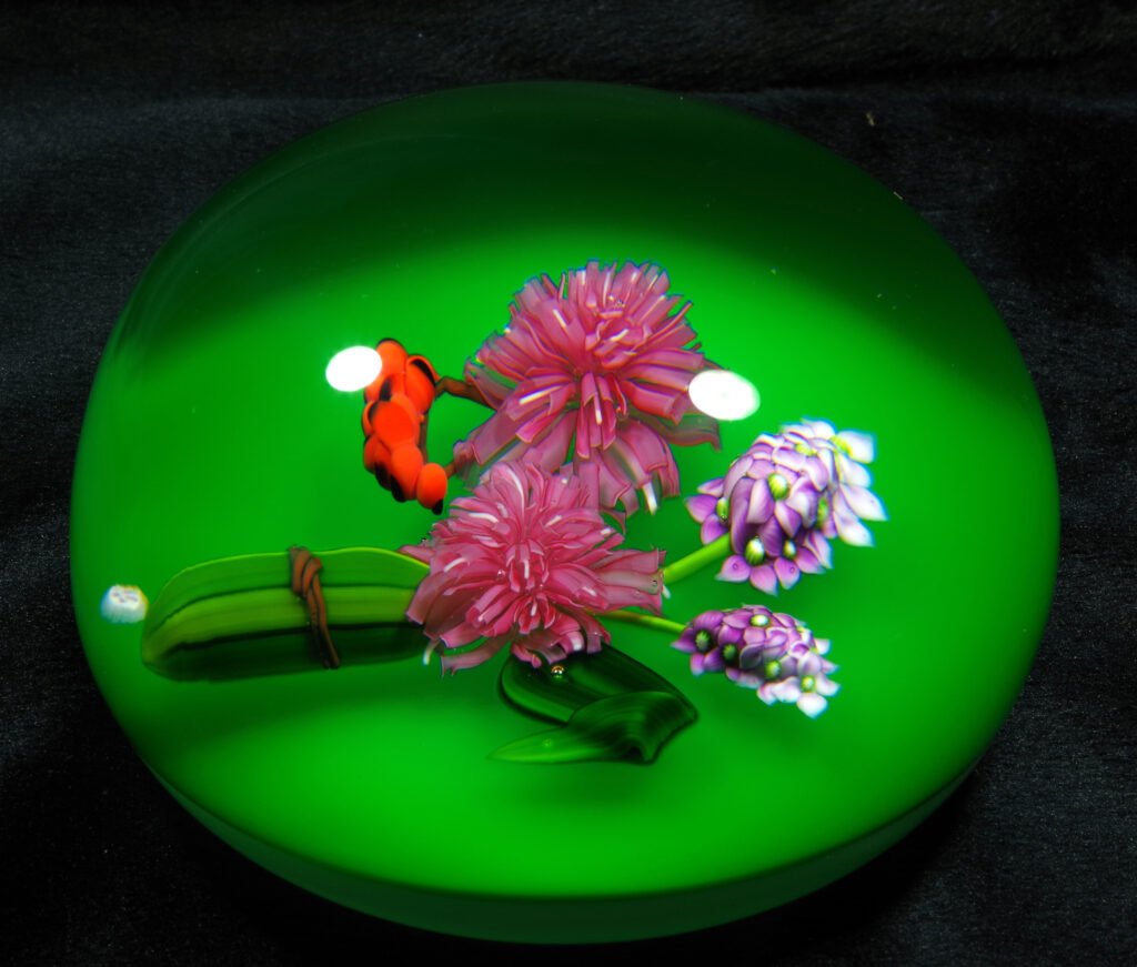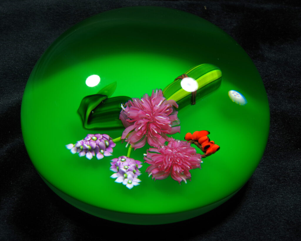 PW3073. Baccarat 1970 Museum Piece: Butterfly over two dahlias on muslin ground. One off. Baccarat butterfly weights have been popular since the mid-19th Century. This is an especially nice one with attractive symmetry. The pink dahlias float just about a pink and white filigree cushion and the butterfly floats above it all. The centers of the wings are millefiori canes. The work nicely fills the crystal dome. Signature cane in the ground “B1970”. Base etched with Baccarat logo and engraved “1970 74”. 3 3/16 inch diameter; 2 inches tall; one pound and five ounces. $600