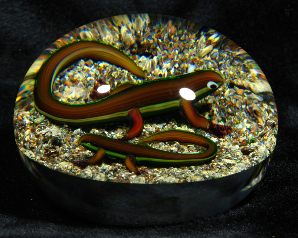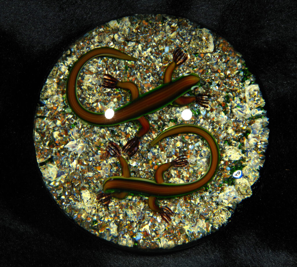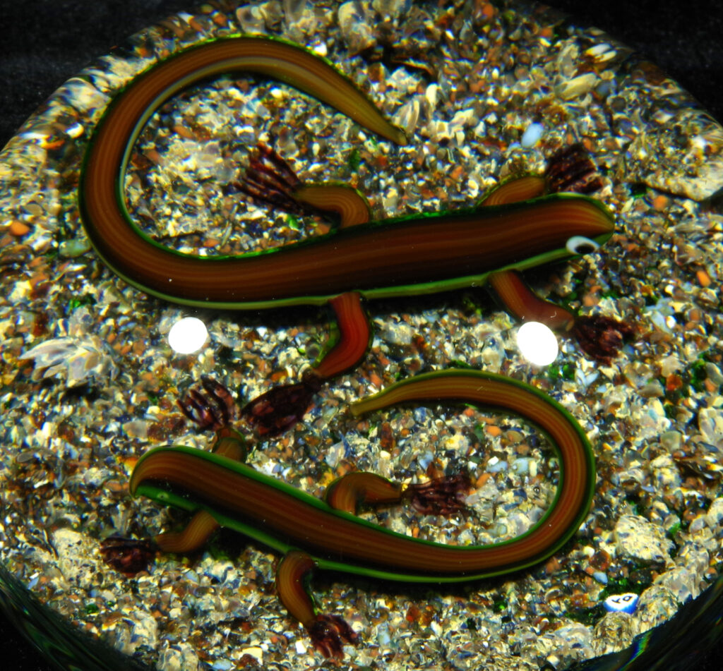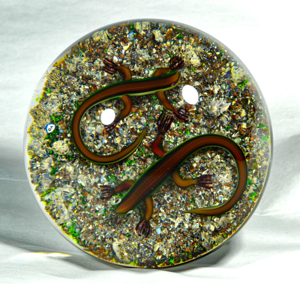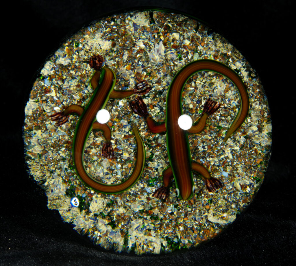 PW1325. Adelmo (Delmo) Tarsitano (1921-1990) Museum Piece. Rare double salamander on a natural ground. These salamanders are exceptional. “DT” cane in the style he used from around 1980 to 1990. 2 7/8 inch diameter; 2  inches tall; fifteen ounces. Condition is excellent with some scratches on the base only.  $700