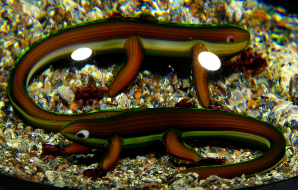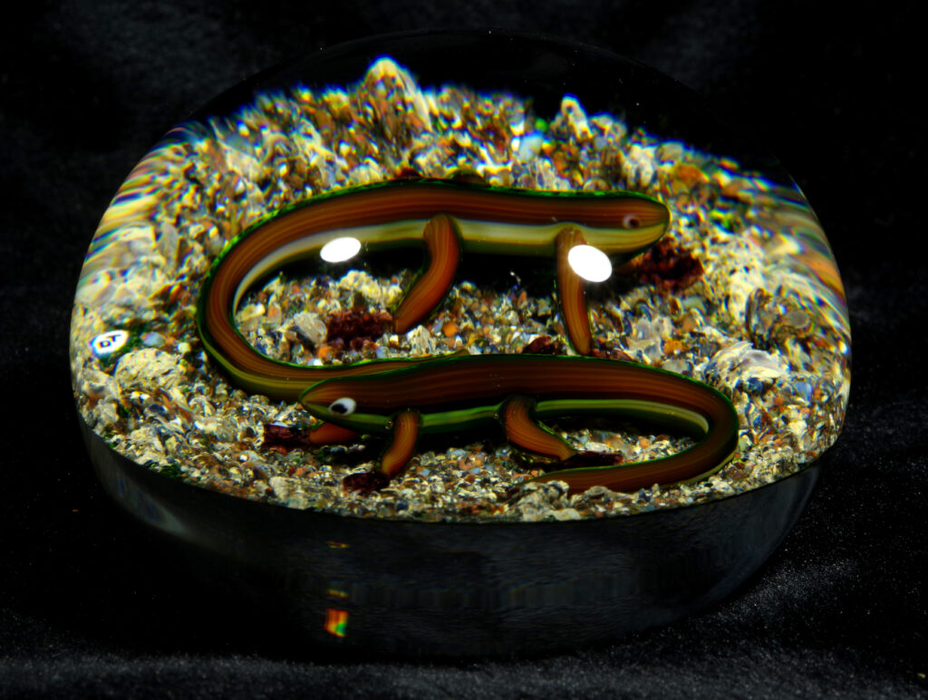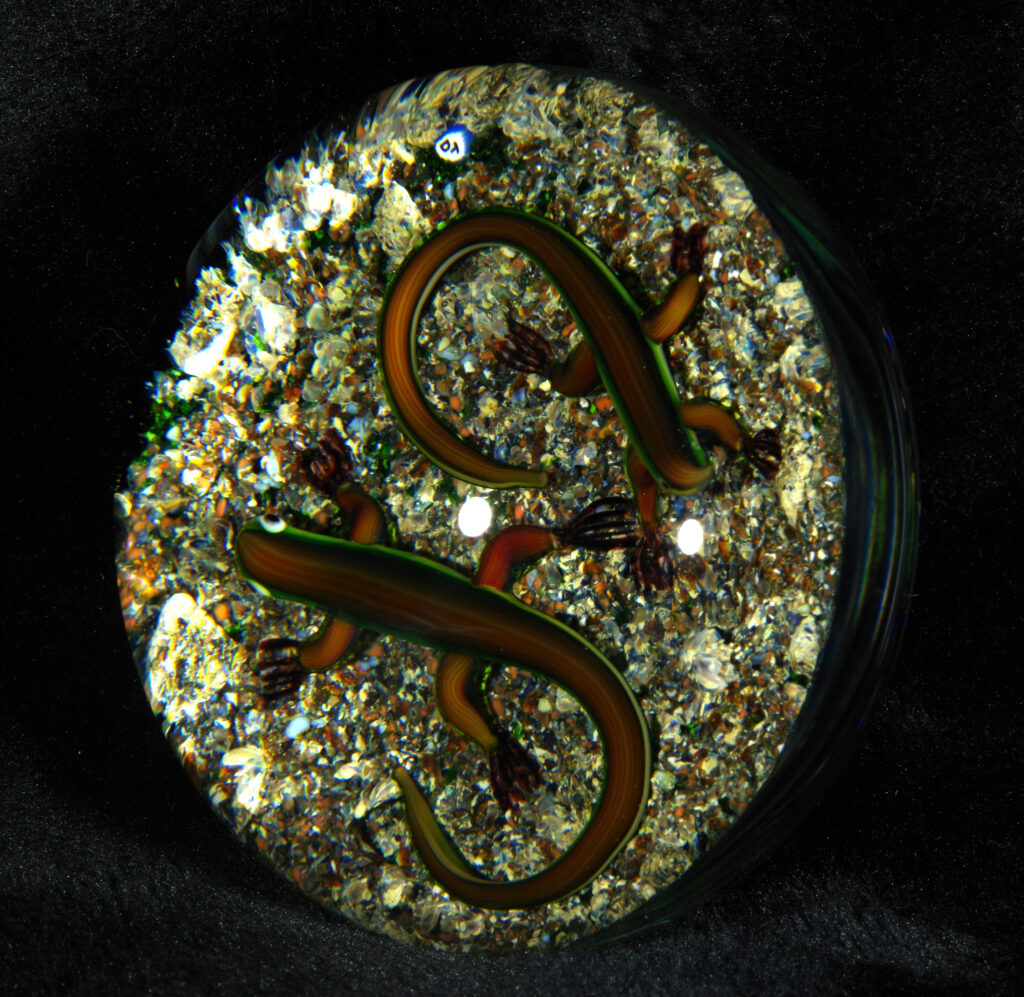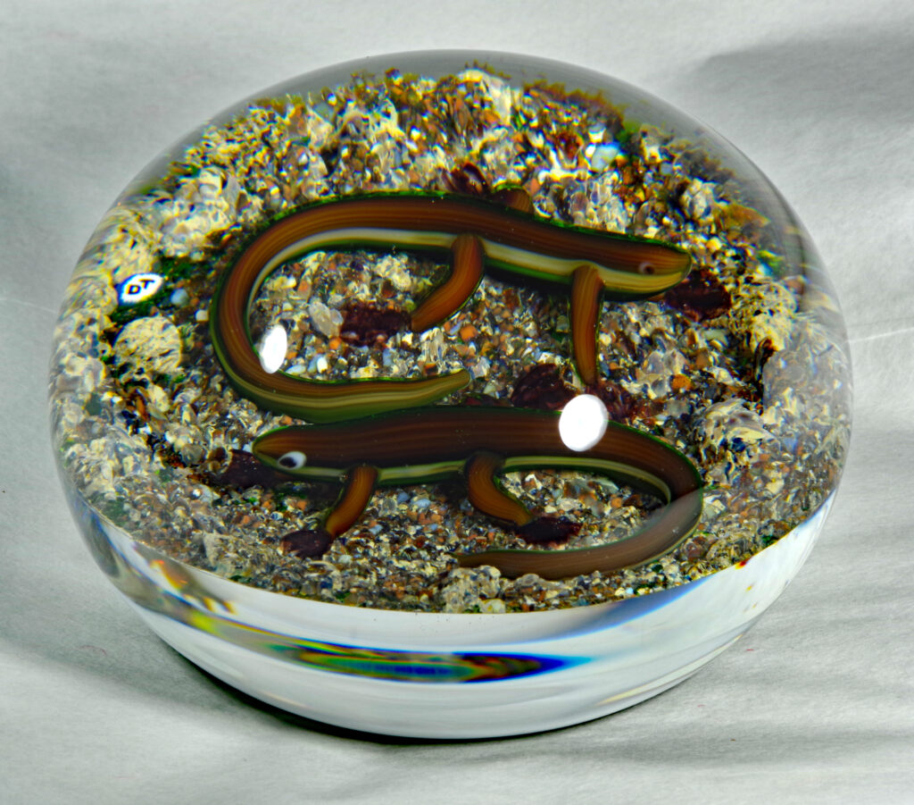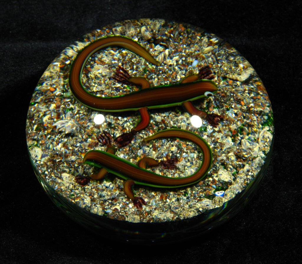 PW1325. Adelmo (Delmo) Tarsitano (1921-1990) Museum Piece. Rare double salamander on a natural ground. These salamanders are exceptional. “DT” cane in the style he used from around 1980 to 1990. 2 7/8 inch diameter; 2  inches tall; fifteen ounces. Condition is excellent with some scratches on the base only.  $700