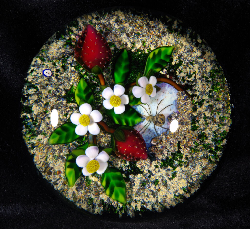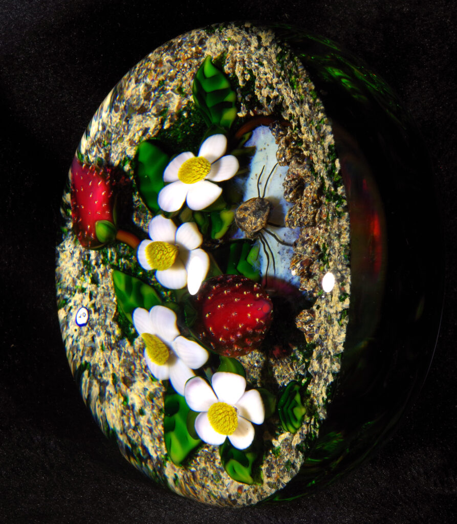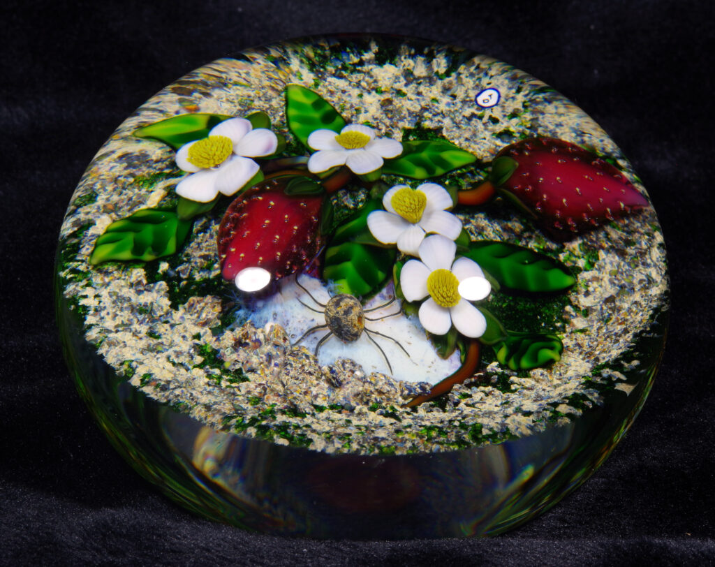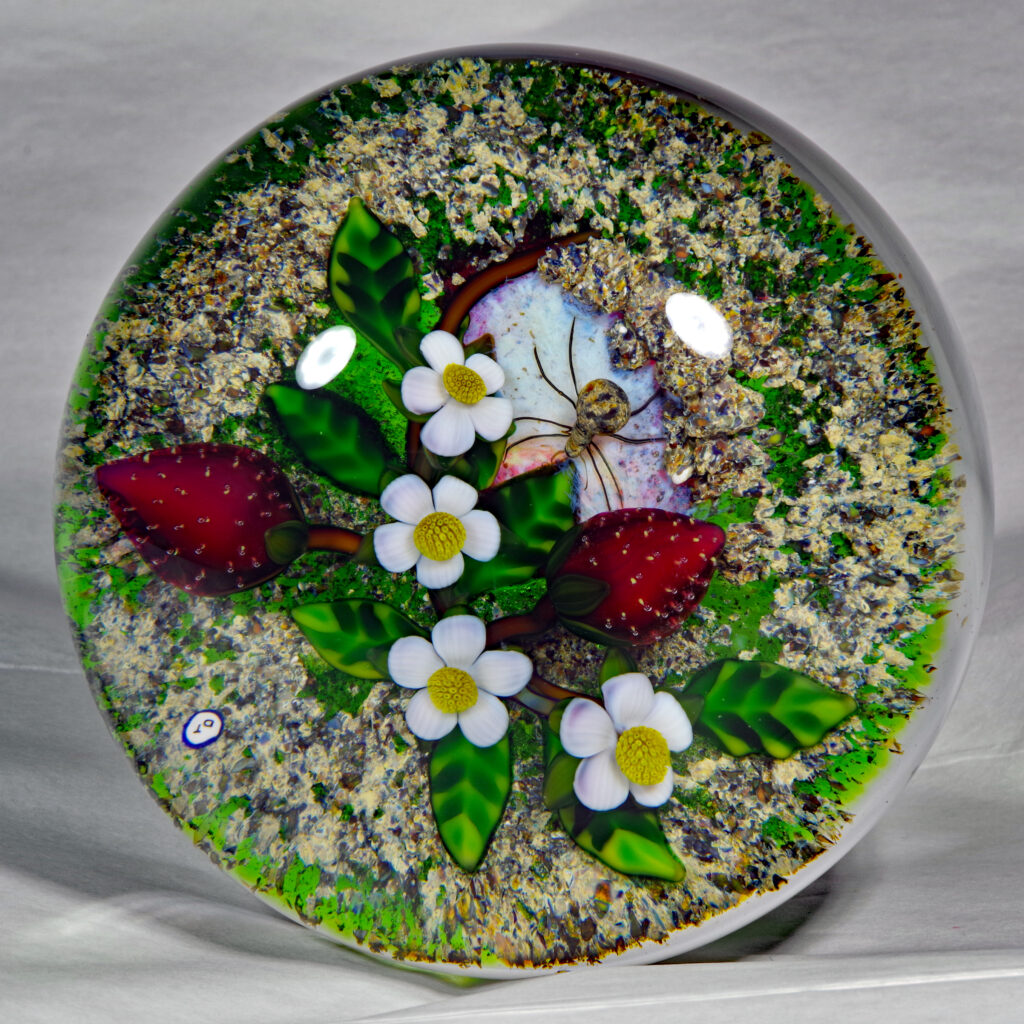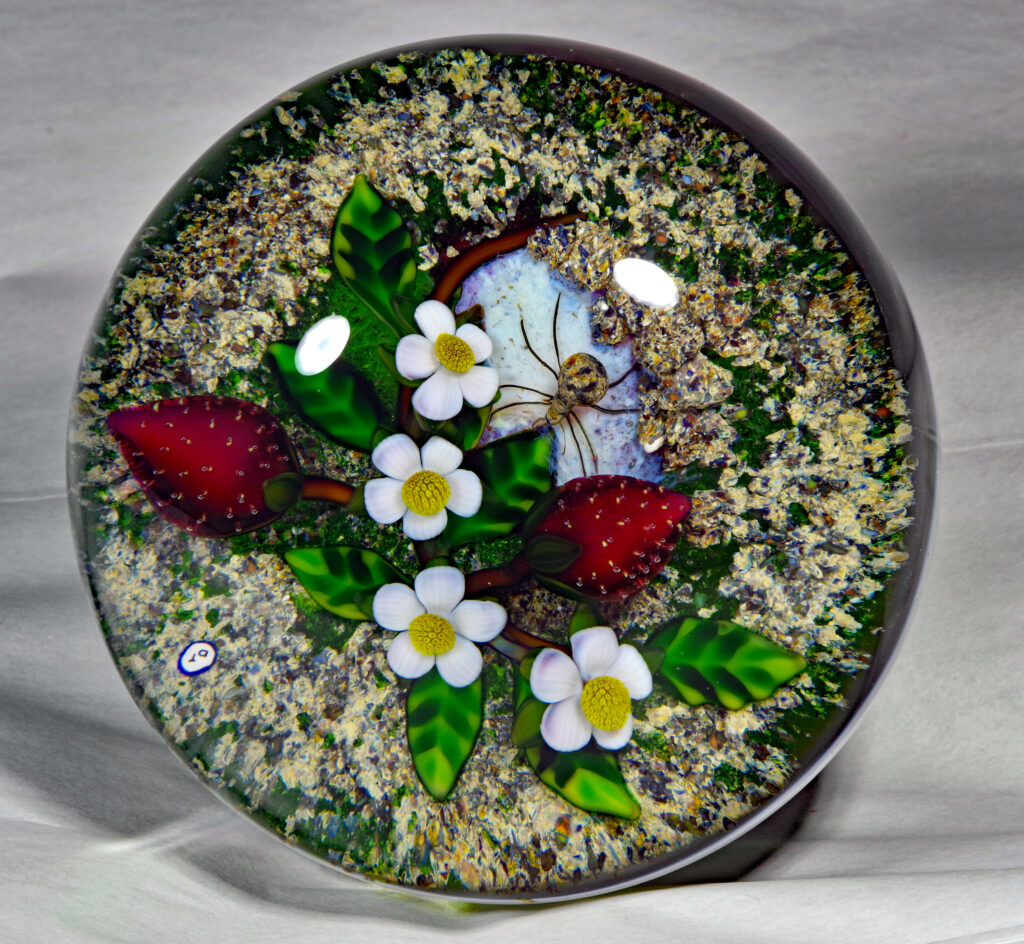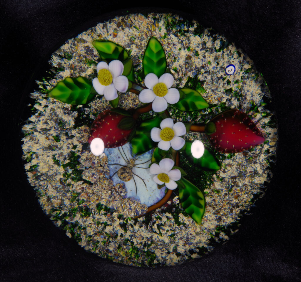 PW3237. Adelmo (Delmo) Tarsitano (1921-1990) Magnum Museum Piece. From his “Earth Life” series. Two plump strawberries and four blossoms are home to a handsome spider whose web glows red from below. Delmo employed his unique red-glowing spider web technique for the ground beneath this amazingly realistic spider – the effect is as if the ground is glowing red. Some of the images are backlit to show this effect. The rest of the ground is naturalistic mossy-sandy. Paperweight expert Paul Dunlop wrote: “With his Earth Life series, as fine as any weights made in the twentieth century, Tarsitano established himself as a major artist.” “DT” cane (used from 1980 until his death in 1990) in the ground. 3 5/8 inches diameter; 2 1/4 inches tall; one pound and nine ounces. Condition is perfect/like new. $1600