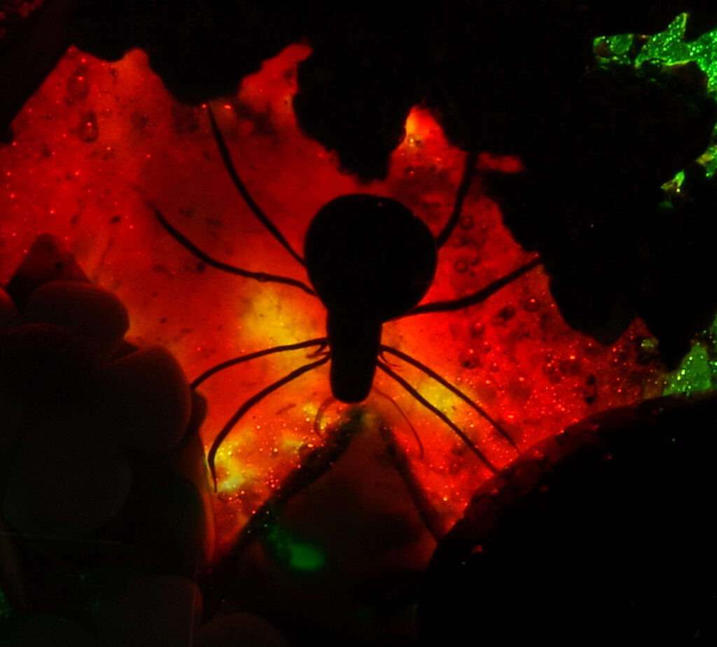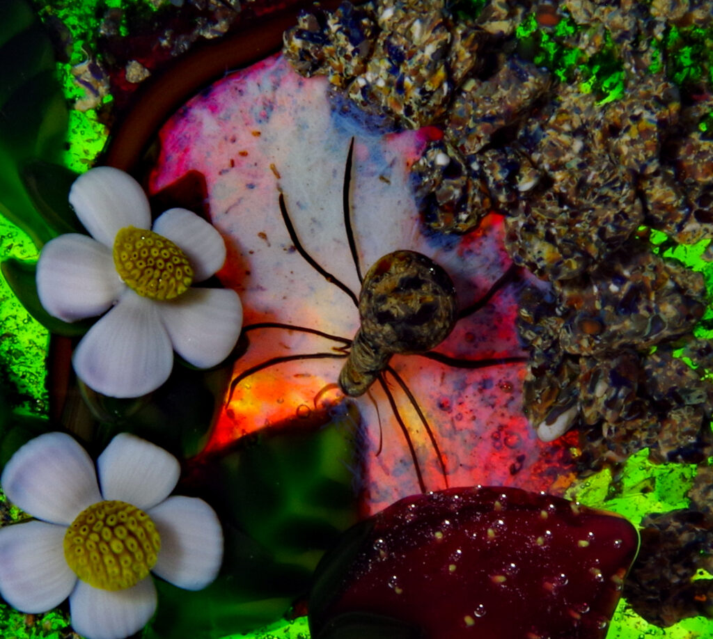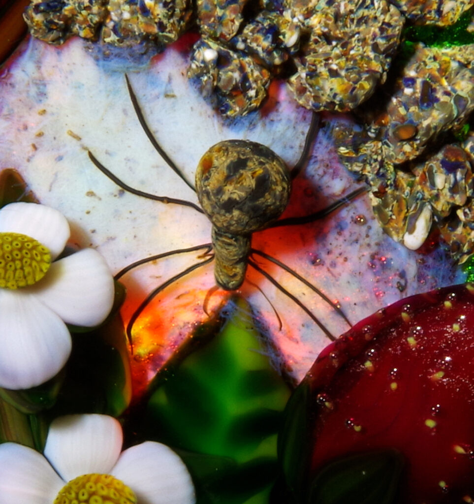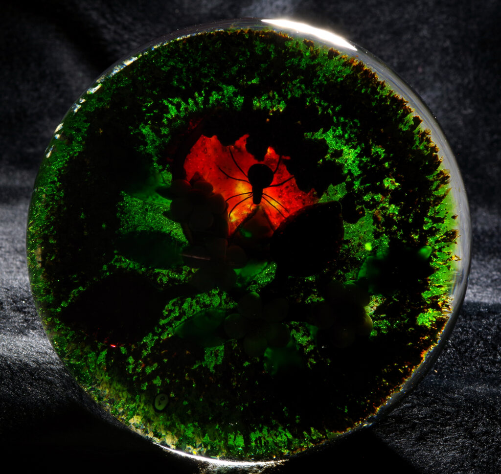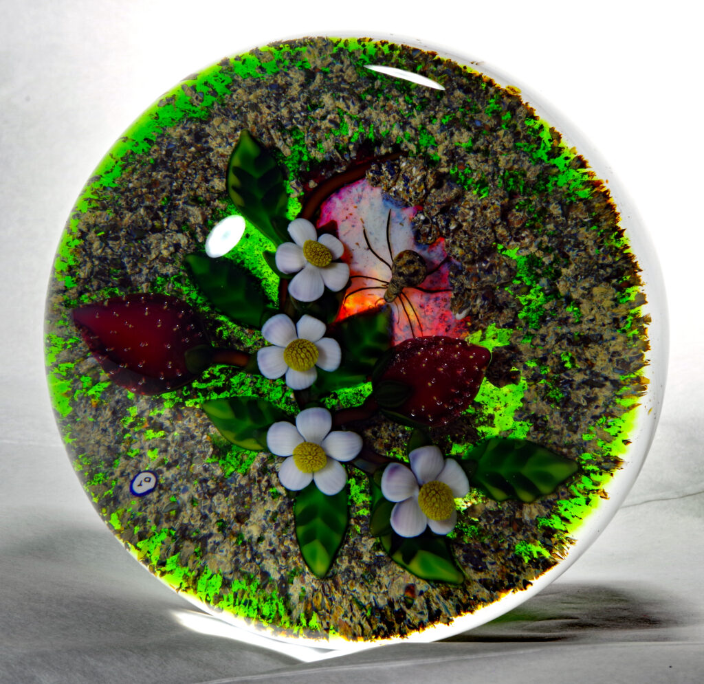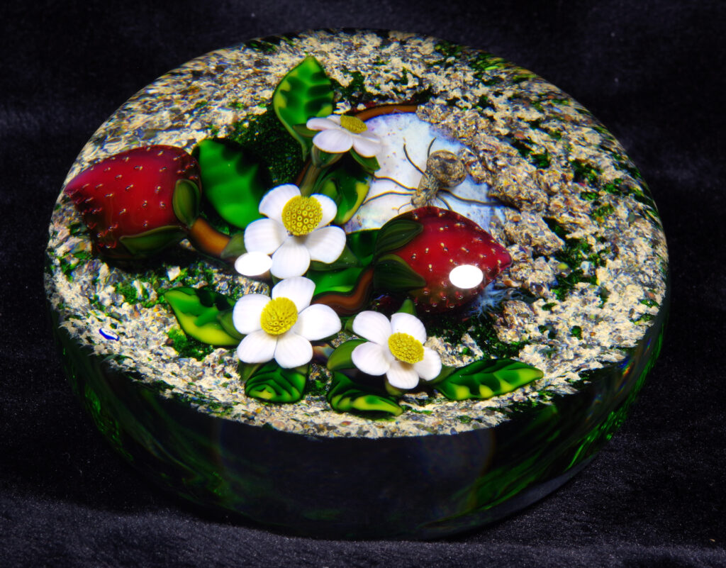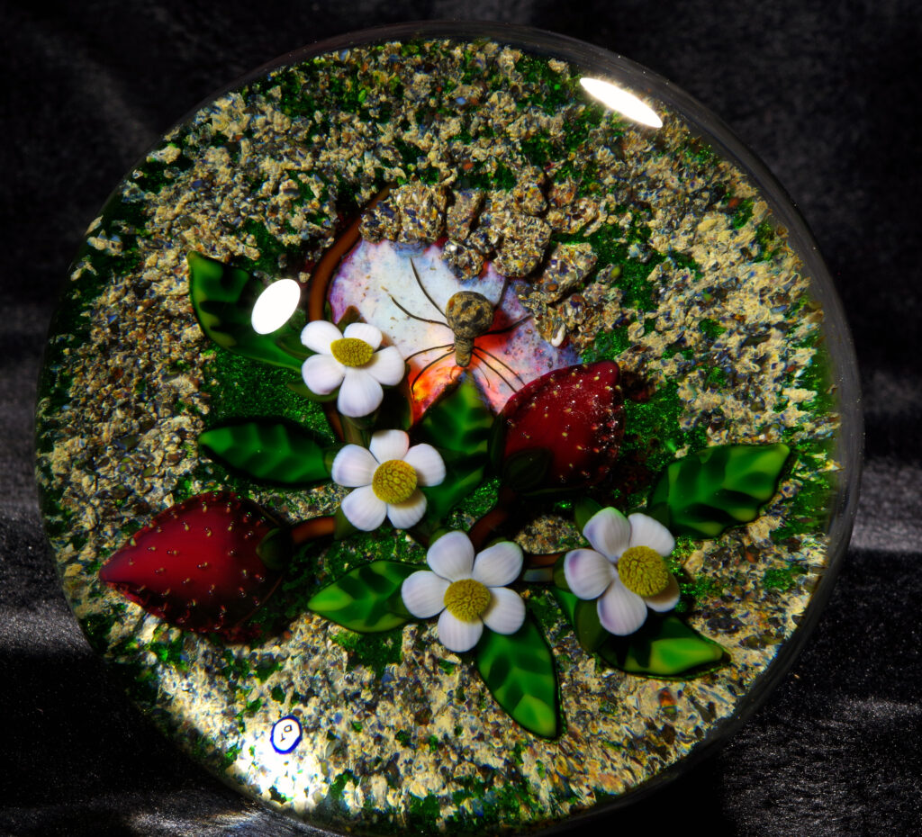 PW3237. Adelmo (Delmo) Tarsitano (1921-1990) Magnum Museum Piece. From his “Earth Life” series. Two plump strawberries and four blossoms are home to a handsome spider whose web glows red from below. Delmo employed his unique red-glowing spider web technique for the ground beneath this amazingly realistic spider – the effect is as if the ground is glowing red. Some of the images are backlit to show this effect. The rest of the ground is naturalistic mossy-sandy. Paperweight expert Paul Dunlop wrote: “With his Earth Life series, as fine as any weights made in the twentieth century, Tarsitano established himself as a major artist.” “DT” cane (used from 1980 until his death in 1990) in the ground. 3 5/8 inches diameter; 2 1/4 inches tall; one pound and nine ounces. Condition is perfect/like new. $1600