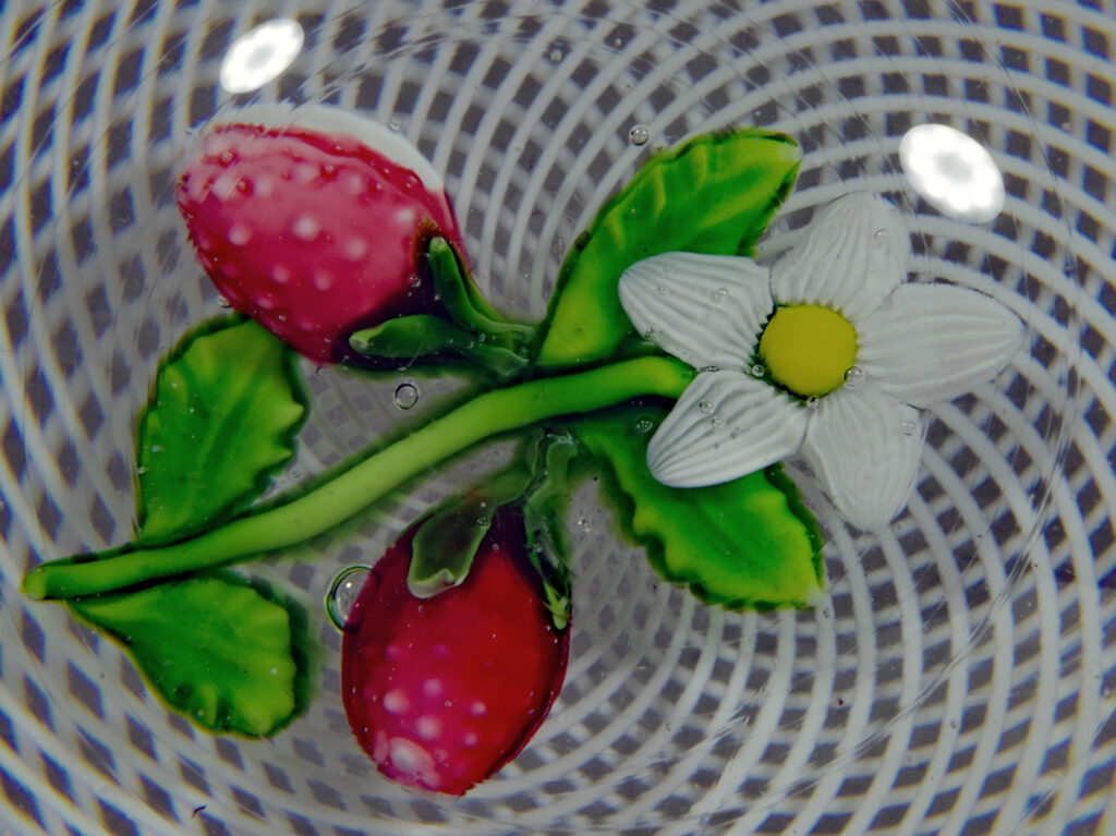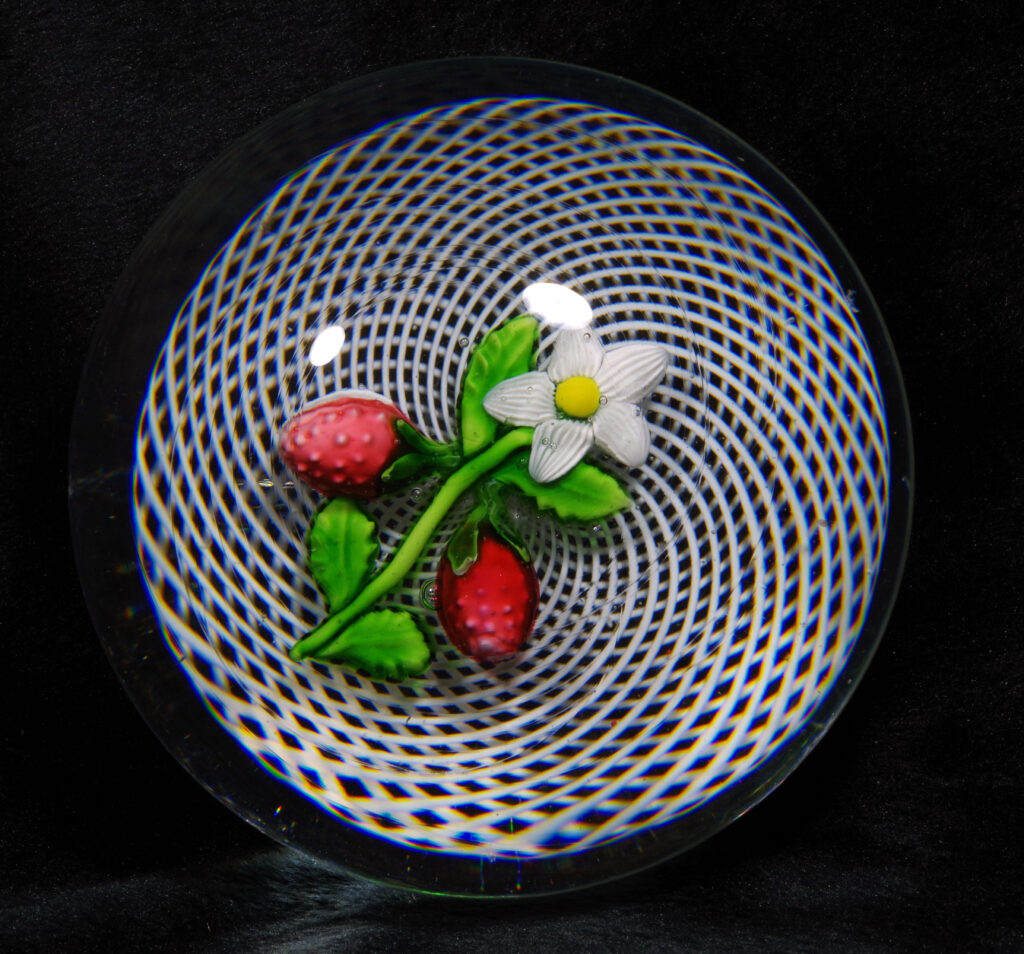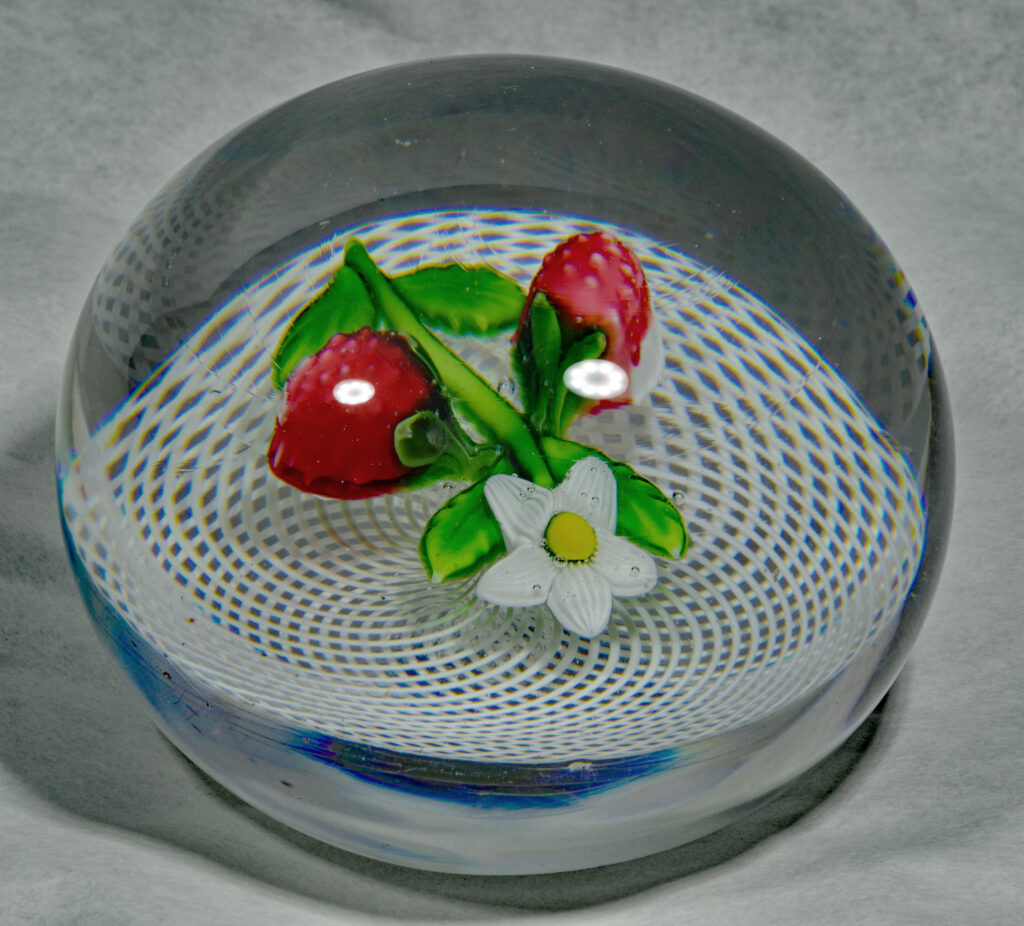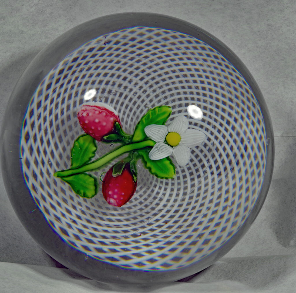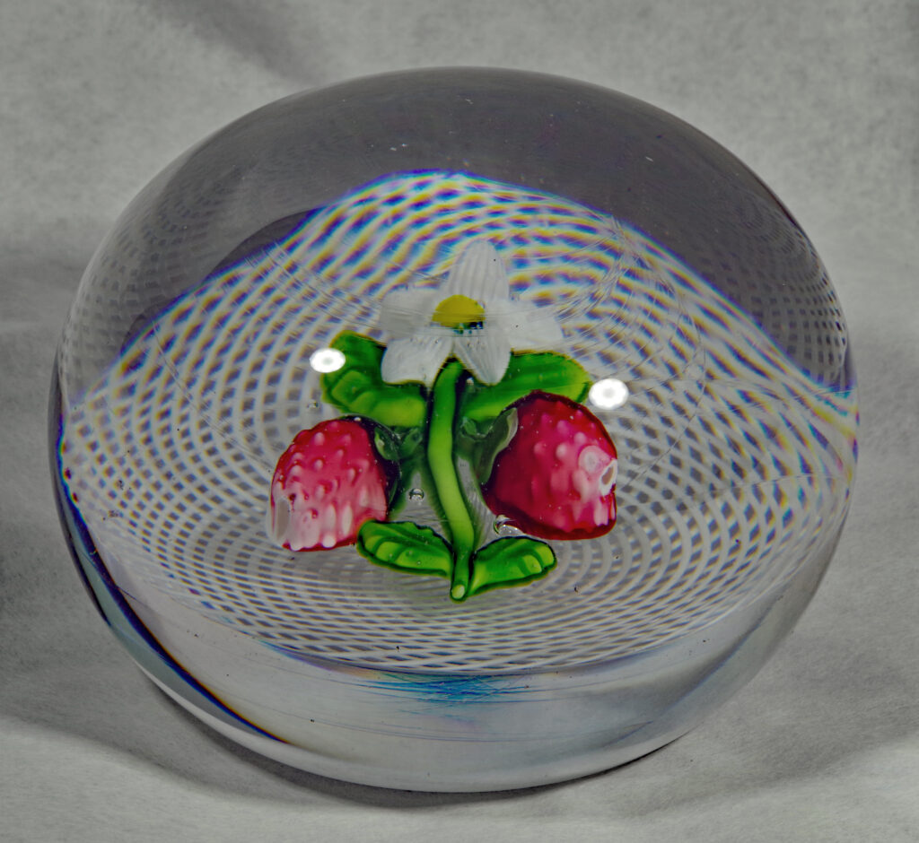 PW1430. Saint Louis Antique Classical Period Museum Piece (circa 1850). Two wild strawberries with blossom over white double spiral filigree ground. One very similar to this is illustrated in The Dictionary of Glass Paperweights on page 321. This is a nice large cabinet piece in excellent condition. The fruit and blossom are well made and well centered and the double filigree cushion is perfect. Condition is excellent with minimal signs of wear only to the base. 2 15/16 inch diameter; 2 1/8 inches tall; one pound and four ounces. $1800
