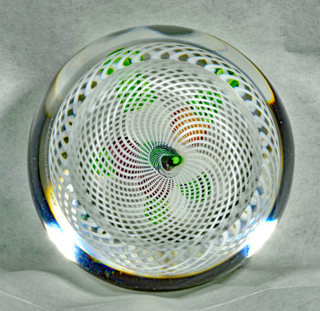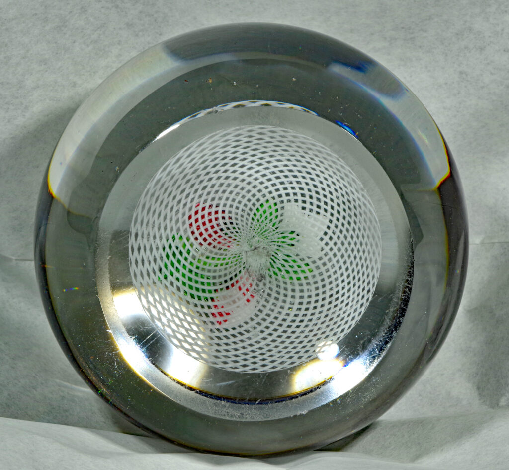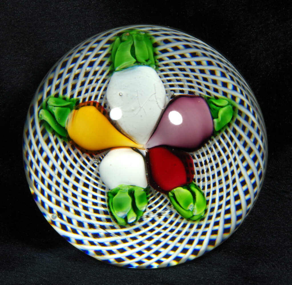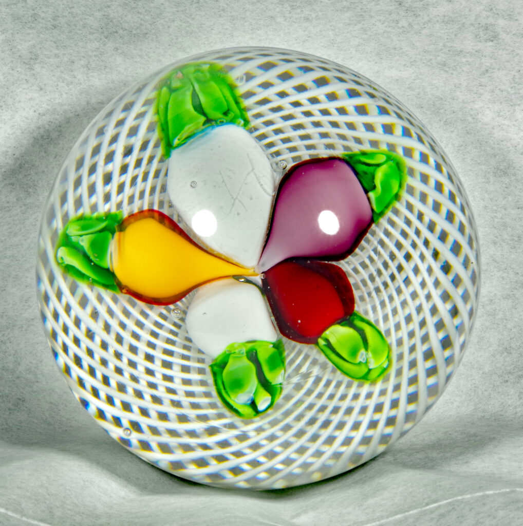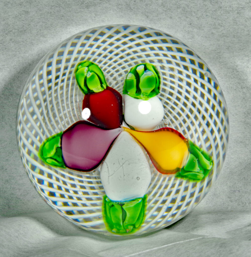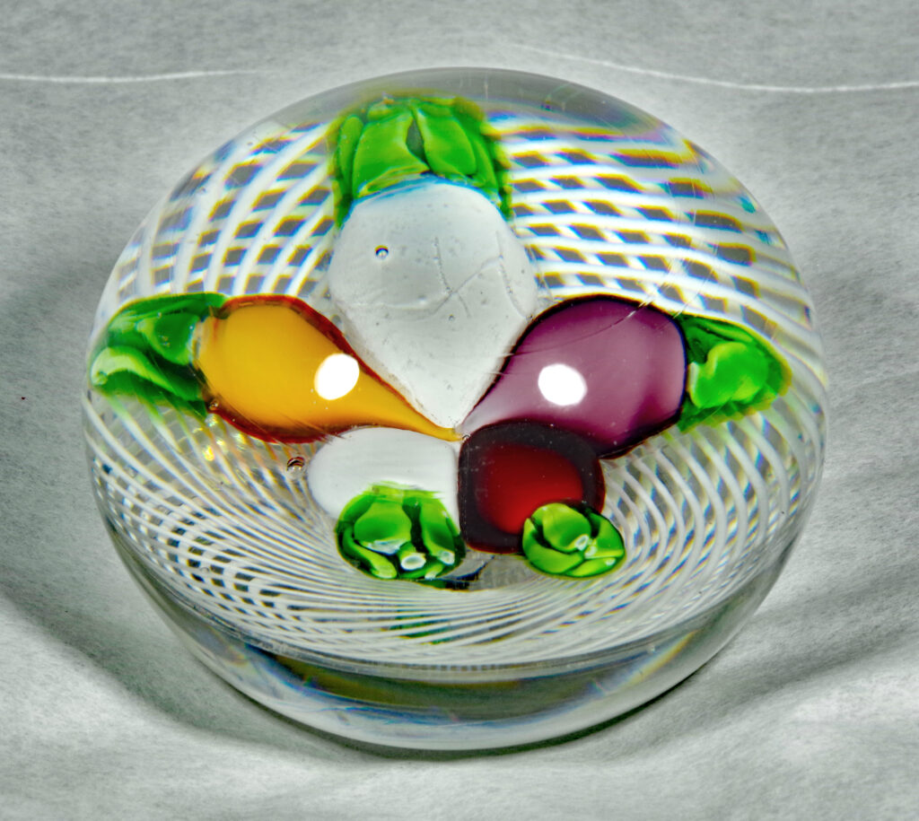 PW2095. Saint Louis Antique Classical Period Museum Piece (circa 1850). Five turnips in three colors. Turnips were an important food crop in 1850. One very similar to this is illustrated in The Dictionary of Glass Paperweights on page 339 which notes that turnips are “an uncommon design from Saint Louis….” This is a fine cabinet piece in excellent condition. The double filigree cushion is perfect. A similar piece resides in the Bergstrom-Mahler Museum and is pictured in the book: Glass Paperweights of the Bergstrom-Mahler Museum. Condition is excellent with minimal signs of wear only to the basal ring. 2 1/2 inch diameter; 1 7/8 inches tall; thirteen ounces. $500